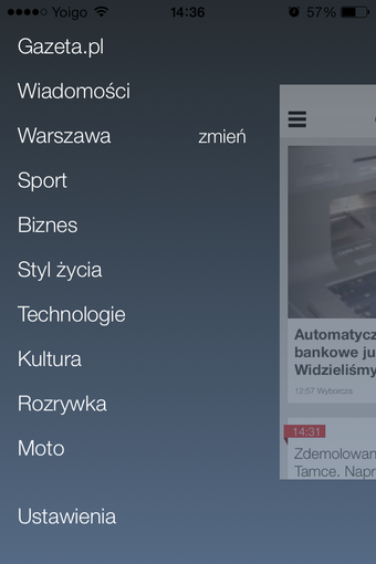 Nawigacja po Gazeta.pl LIVE jest bardzo prosta. Oprócz głównego widoku, w którym wyświetla się lista wiadomości, aplikacja posiada boczne menu z kategoriami. Między rodzajami newsów można również przemieszczać się poprzez przesuwanie ekranu w prawo lub lewo.